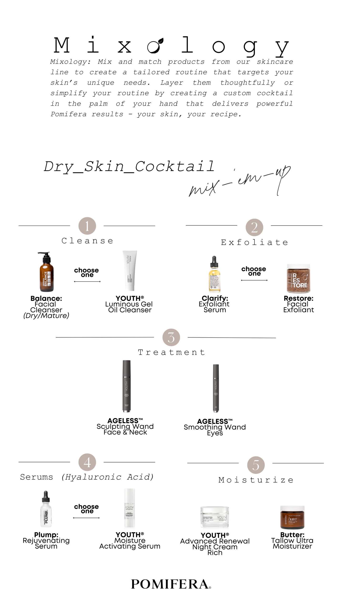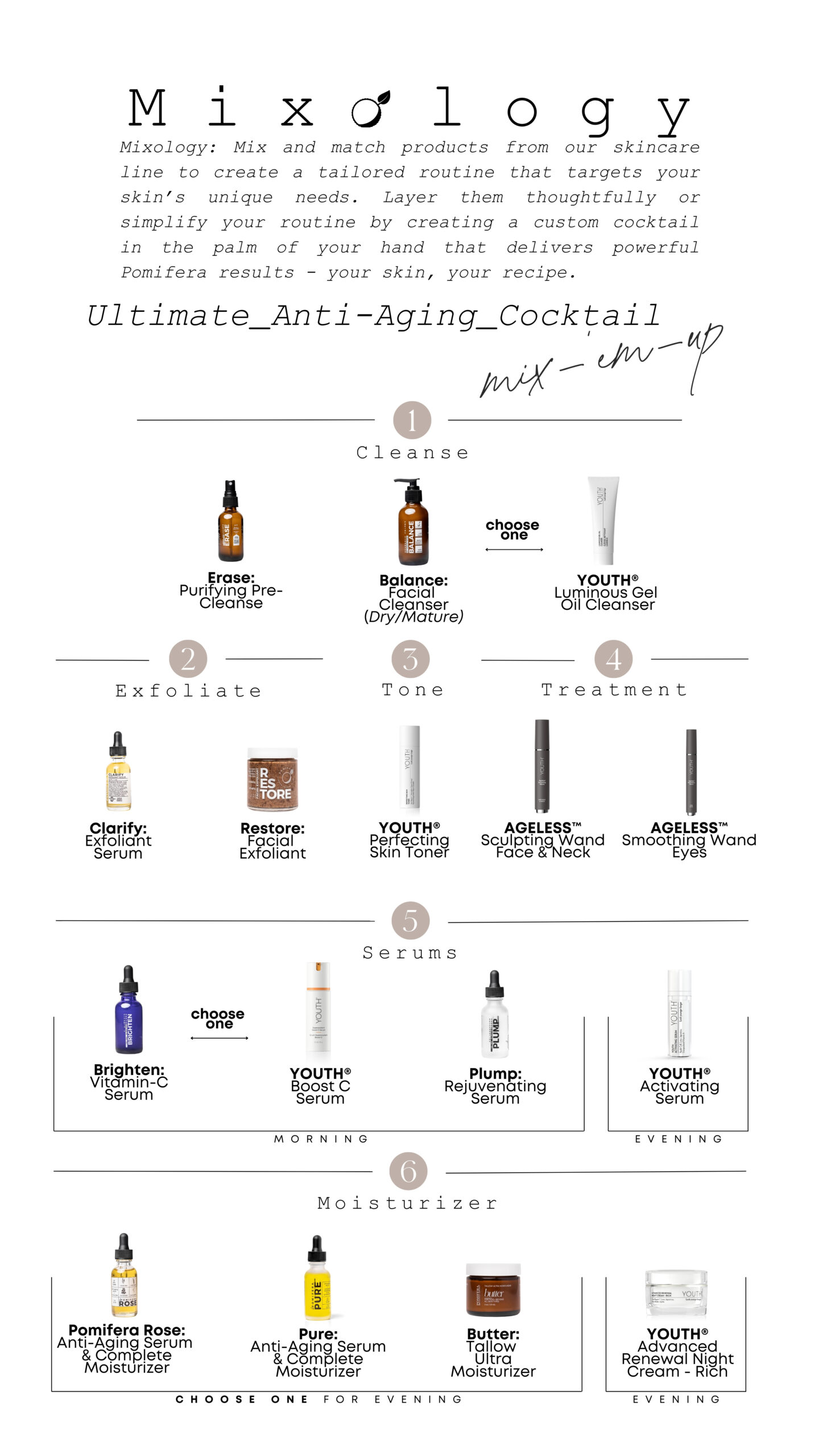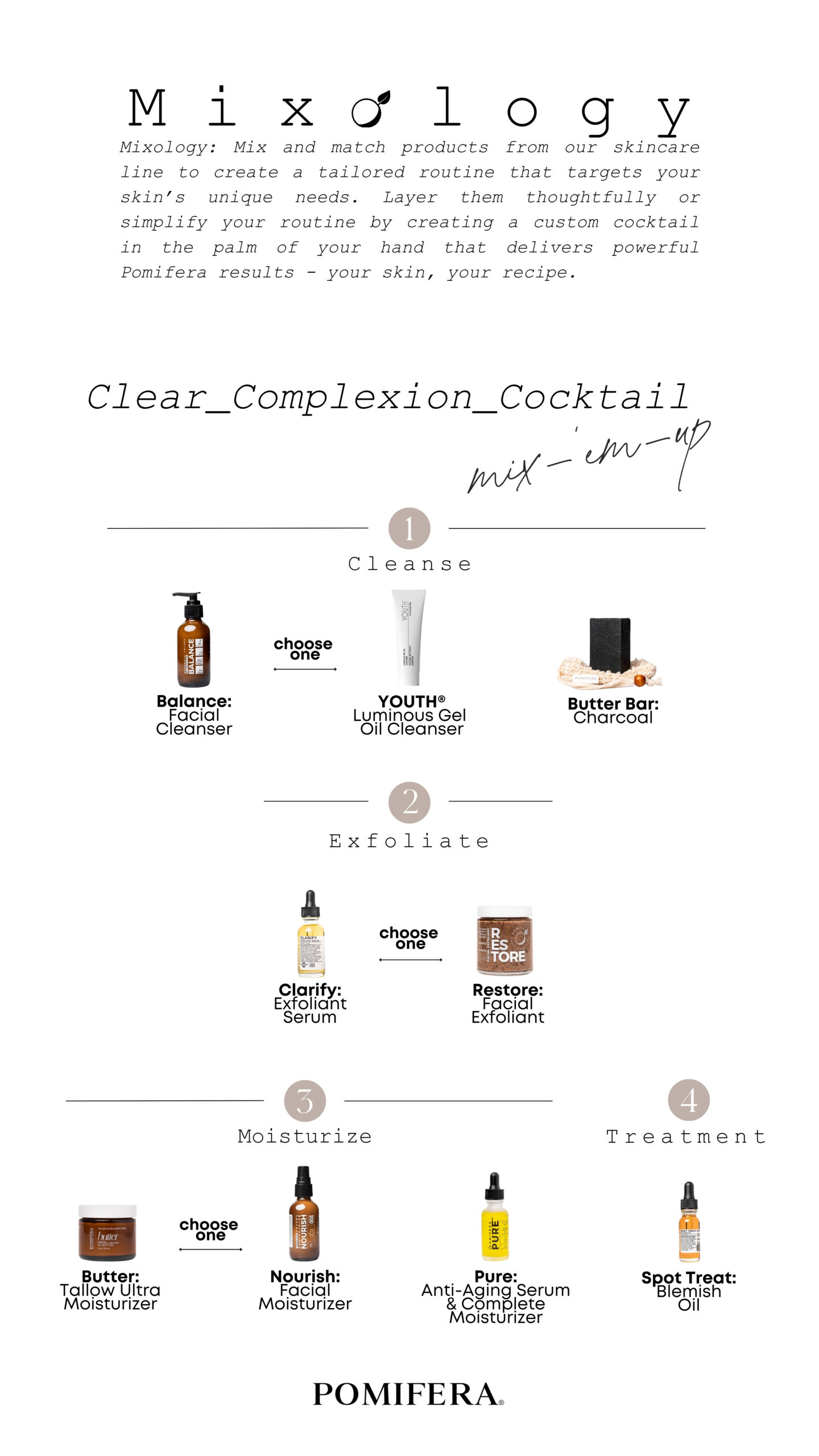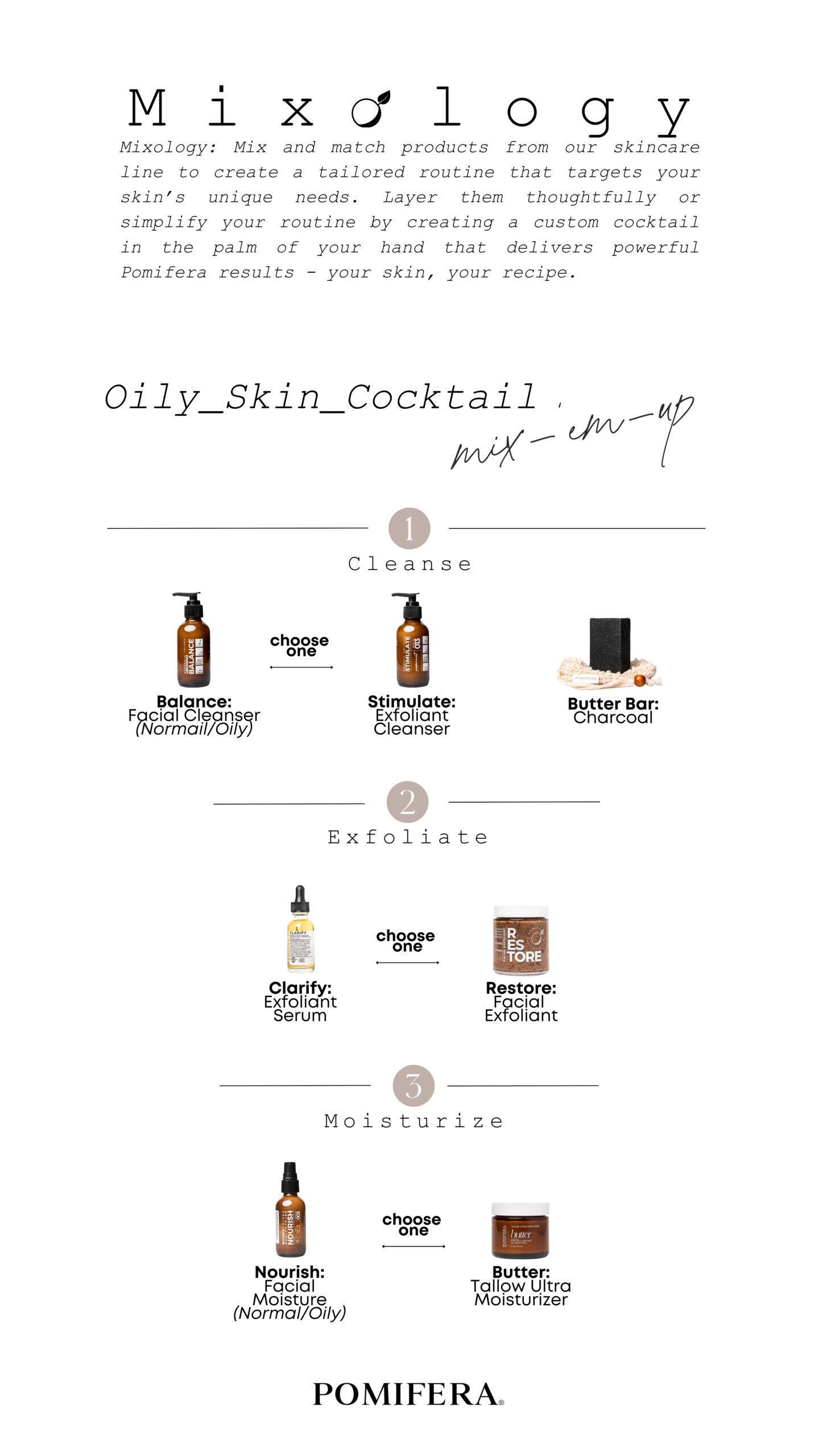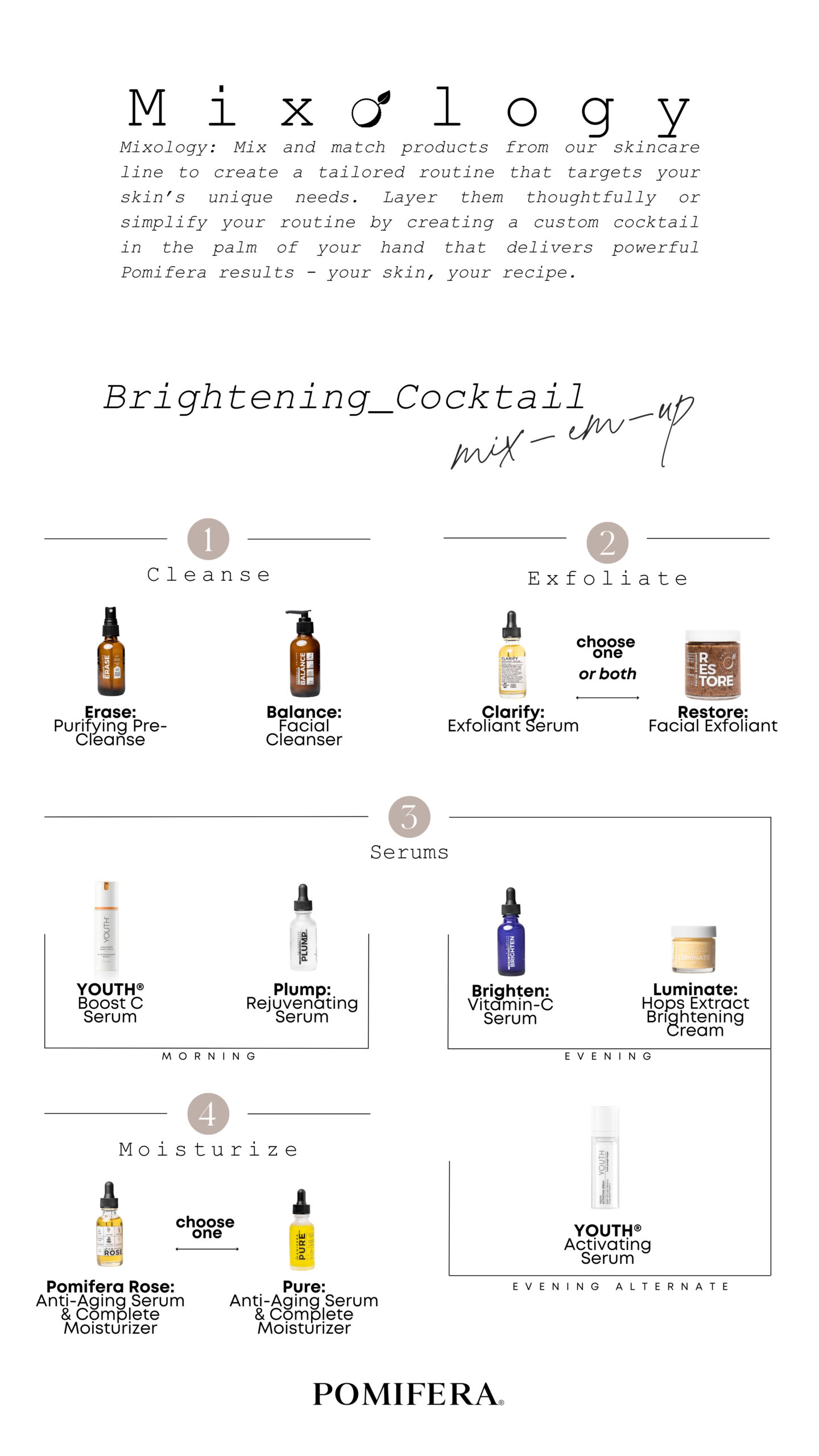 Mix and match products from our skincare line to create a tailored routine that targets your skin’s unique needs. Layer them thoughtfully or simplify your routine by creating a custom cocktail in the palm of your hand that delivers powerful Pomifera results – your skin, your recipe.